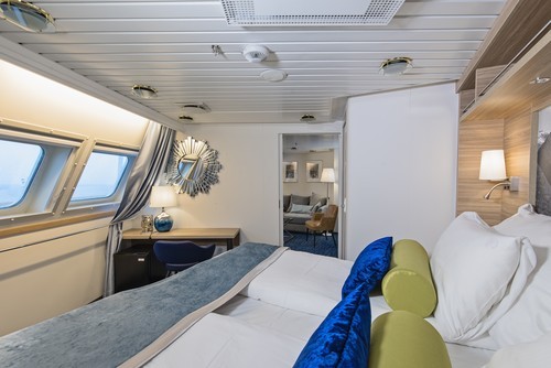 These elegant, refurbished suites are situated on the upper deck. They feature a separate bedroom, double bed, sofa in the sitting area that can be made∘ into a double bed, free Wi-Fi, TV, hair dryer, bathrobes, blanket, and coffee and tea facilities.