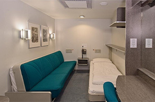 2- or 3-bed cabin with a bed and sofa bed. Categories L & J have limited or no view. Categories J & U have a 3-bed cabin with a bunk bed.