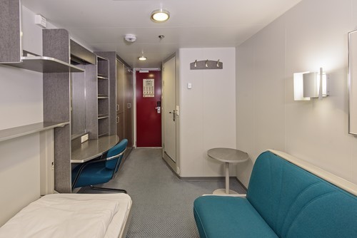 These comfortable, standard inside cabins for up to two people∘ on the lower deck have separate single beds, one of which converts into a sofa, plus one chair and desk.