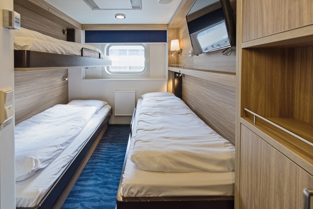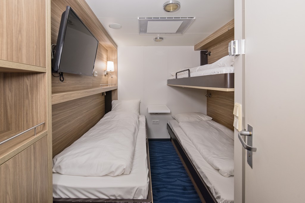 Our cosy Polar Inside cabins can be found on all decks. All cabins include bathrooms with shower/WC. These comfortable, refurbished standard inside cabins for three people on the upper deck have separate single beds, one of which converts into a sofa, bunk beds, and a TV.